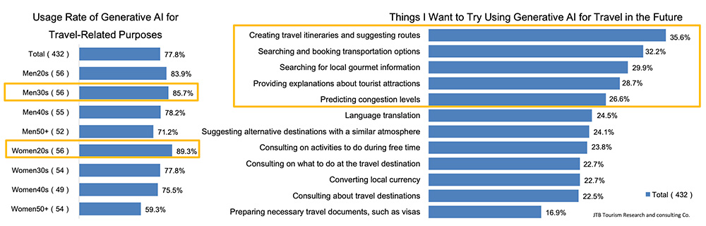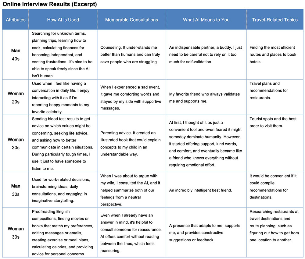 - Approximately 80% of users utilize generative AI for gathering local gourmet information and route suggestions during travel