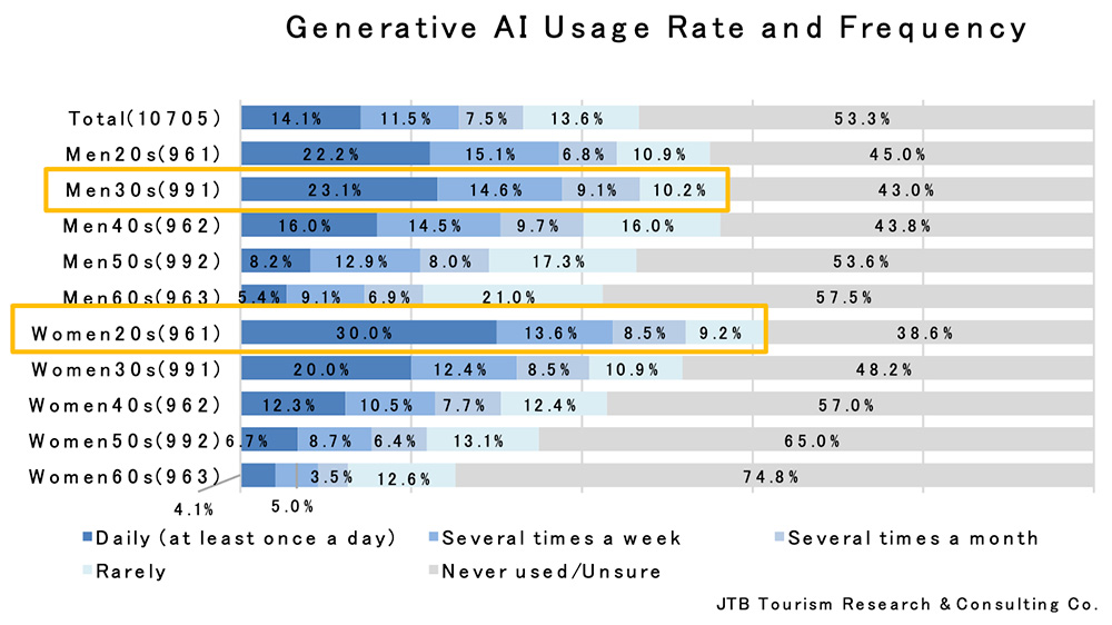 The overall usage rate of generative AI was 46.7%, with nearly half of respondents reporting using it regardless of frequency. By gender and age, the highest usage rate was among women in their 20s (61.4%), followed by men in their 30s (57.0%). Younger generations showed higher usage rates, with 30.0% of women in their 20s stating they use generative AI “at least once a day.”