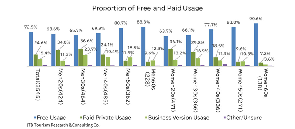 While 72.5% of users utilize generative AI within free limits, 24.6% use paid versions for private purposes. Among women in their 20s and men in their 30s, over 30% reported using paid versions.