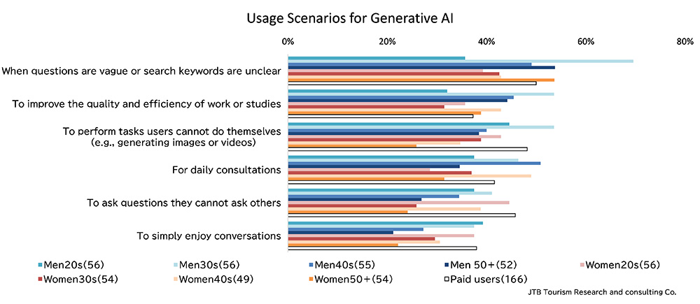 Users employ generative AI for various purposes, including: – When questions are vague or search keywords are unclear – To improve the quality and efficiency of work or studies. – For tasks users cannot do themselves (e.g., generating images or videos). – For daily consultations, asking questions they cannot ask others, or simply enjoying conversations.