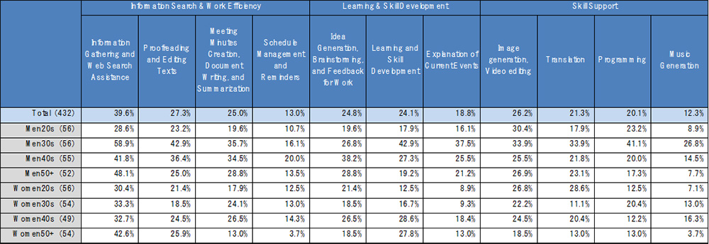Specific usage examples include: – Information Search & Work Efficiency: Search assistance, proofreading, and editing. – Learning & Skill Development: Idea generation and brainstorming for work. – Skill Support: Image generation, video editing, and translation. – Daily Consultations: Health management, travel planning, recipe suggestions. – Life Consultations: Life planning, relationship advice, parenting, career guidance.