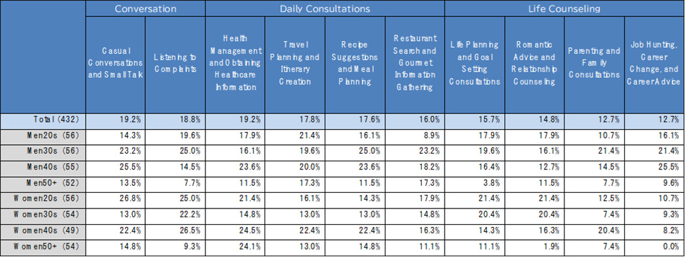 When analyzed by gender and age group, both men and women in their 40s showed a higher tendency to use generative AI for “daily consultations,” while women in their 20s were more likely to use it to “ask questions they cannot ask others” and “simply enjoy conversations.” Additionally, paid users showed a higher tendency to use generative AI for “tasks users cannot do themselves,” as well as “asking questions they cannot ask others” and “enjoying conversations.”