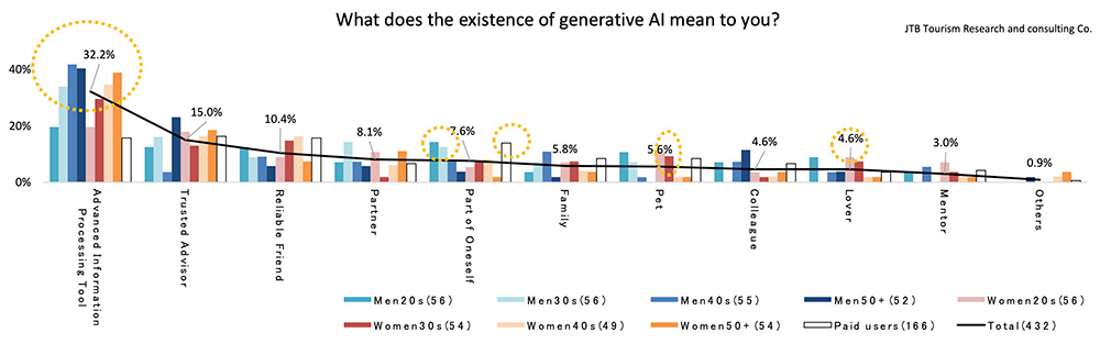When analyzed by demographic attributes, older generations were more likely to view generative AI as a “high-level information search tool.” On the other hand, women in their 20s were more likely to perceive it as a “pet” or “romantic partner,” while men in their 20s and paid users showed a relatively higher tendency to view it as “part of oneself.”