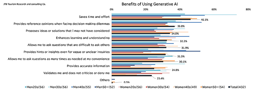 The benefits of using generative AI include “saving time and effort,” “providing reference opinions when facing decision-making dilemmas,” and “suggesting ideas that users may not have realized themselves.”