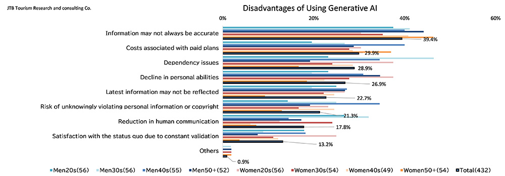 While the use of generative AI among travelers is expanding, the most commonly cited disadvantage of its usage is “information may not always be accurate”. Generative AI may not always adapt to the latest updates, local changes, or nuanced details. Furthermore, if issues arise due to information provided by generative AI, the responsibility may be unclear, potentially leading to disadvantages for travelers. To ensure a worry-free travel experience, providing accurate and reliable information is essential. In this context, tourism operators may find increasing value in offering “peace of mind and safety” that AI cannot guarantee, selecting and providing highly reliable information, and establishing systems to take responsibility in case of any issues.